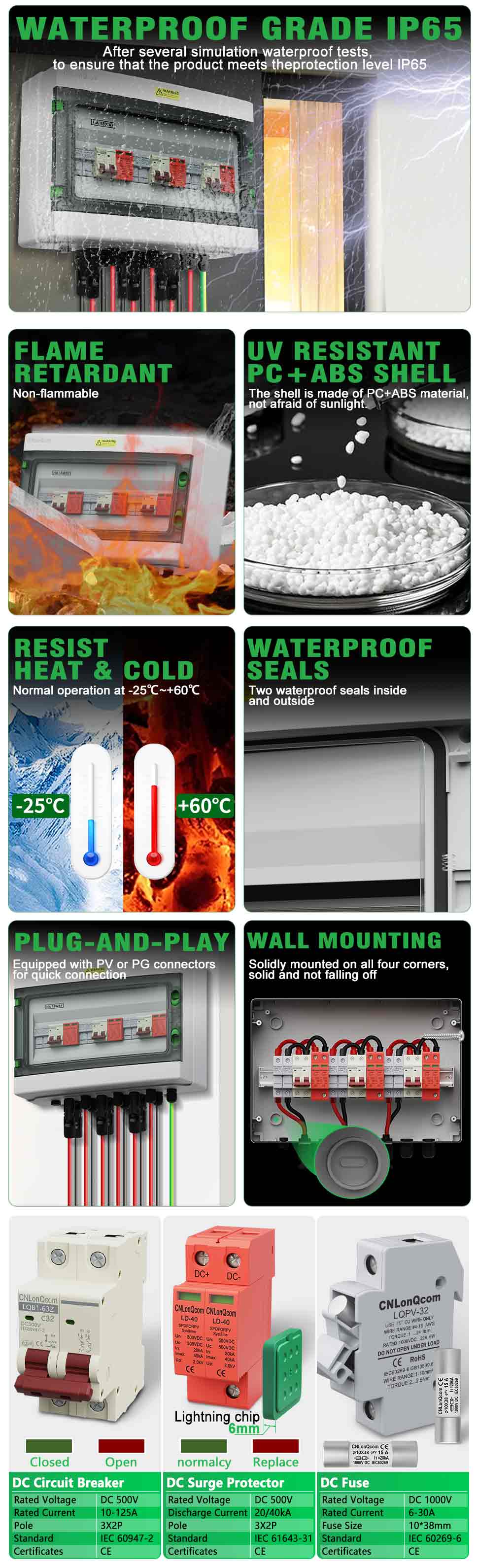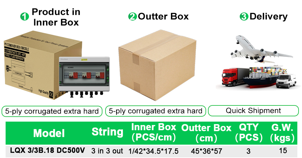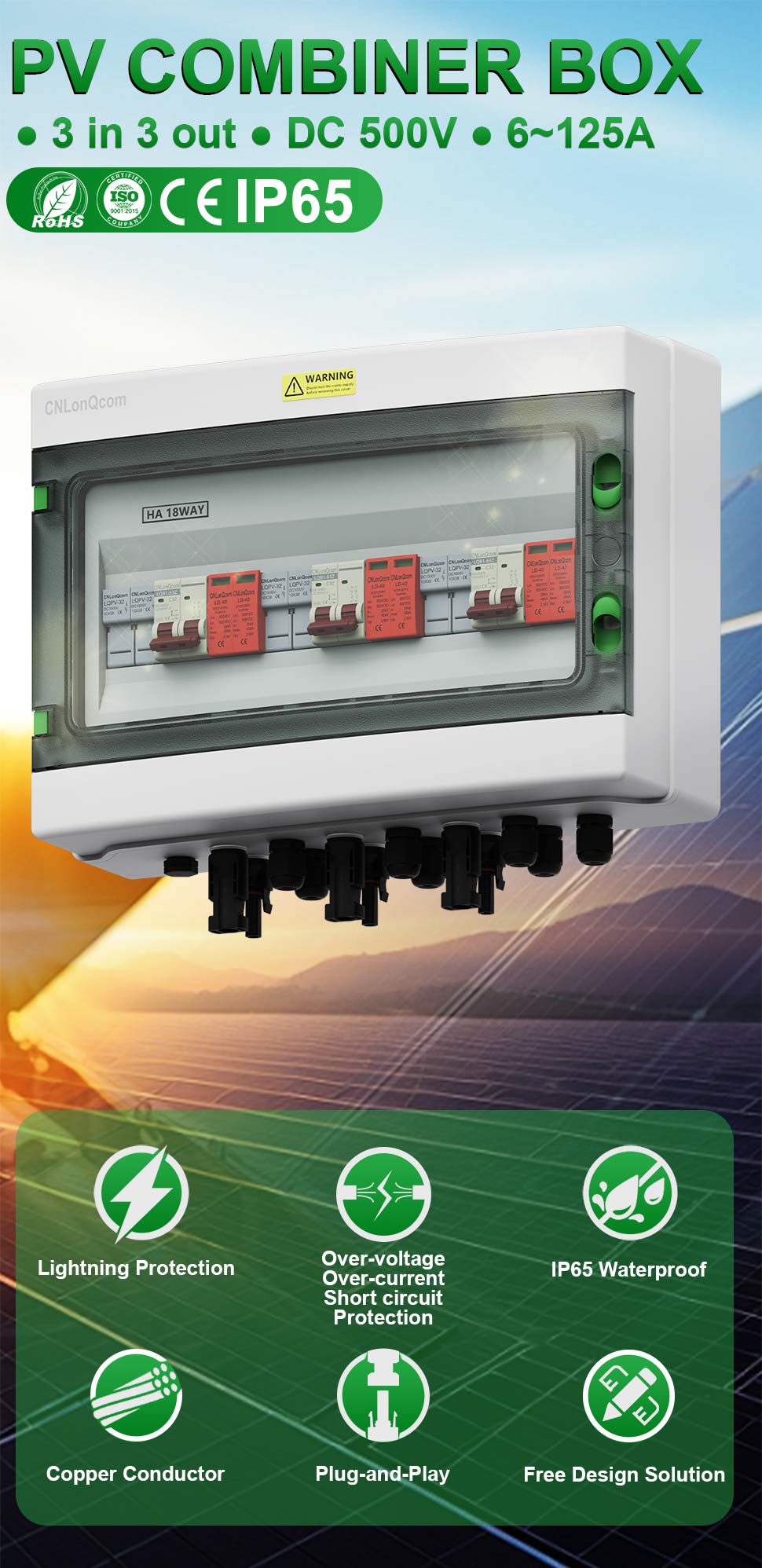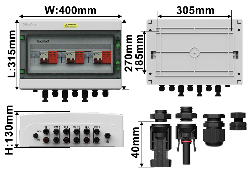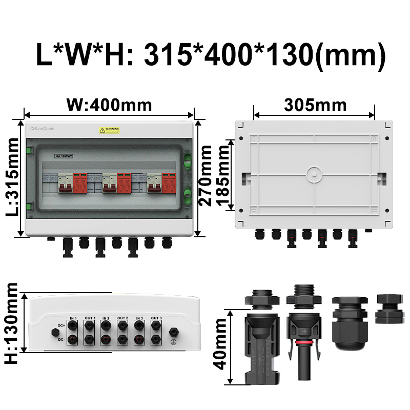 „Cnlonqcom“ „HA“ serijos plastikinis PV kombinuotojo 3 langelis 3 iš 3 „DC500V“ turi PC+ABS vandeniui atsparų dėklą su sandariu konstrukcija, apsauga nuo perkrovos, apsauga nuo trumpo jungimo, apsauga nuo viršįtampio, dulkių, drėgmės ir apsaugos nuo žaibo.