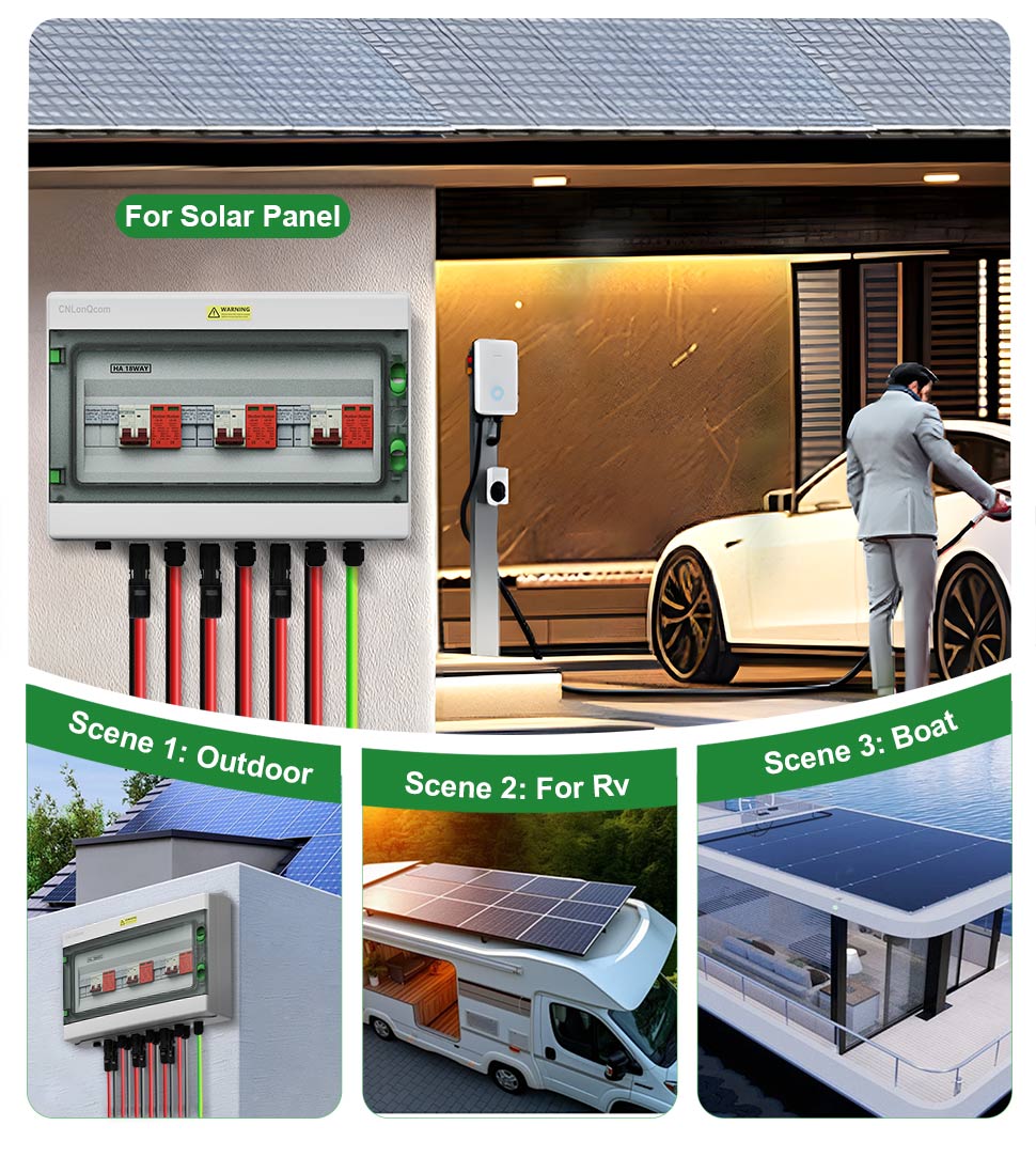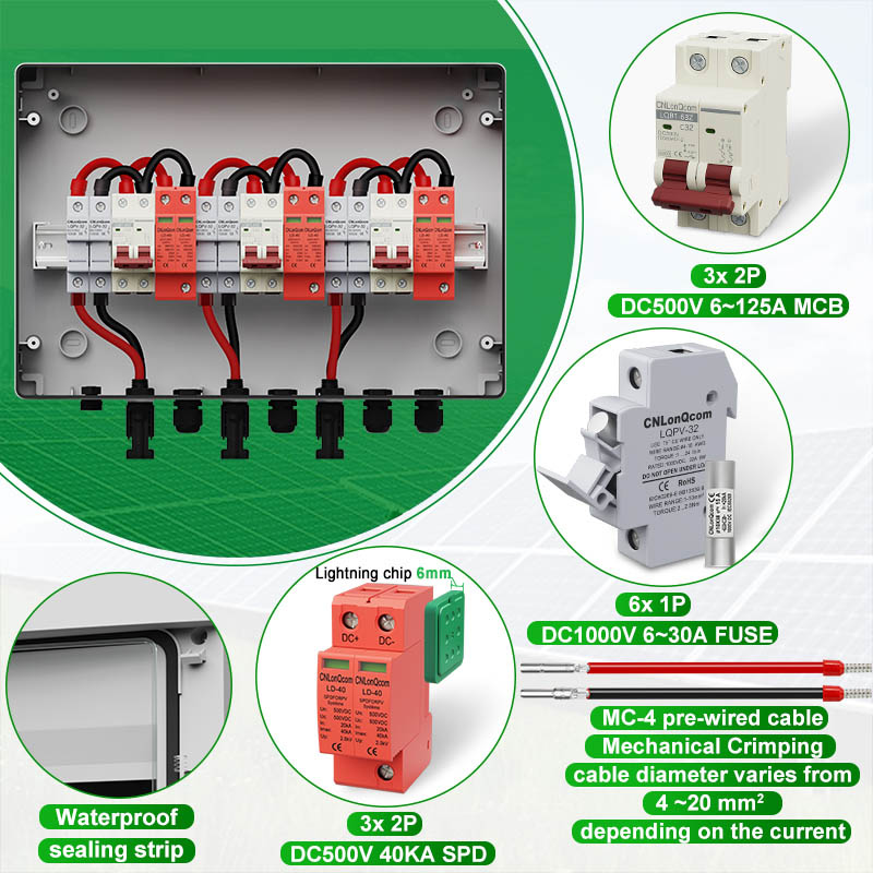 „Cnlonqcom“ HA serijos plastikinis PV kombinuotojo 3 langelis 3 iš 3 DC500V/600 V/800 V yra daugiausia naudojamas PV sistemoms apsaugoti ir dažnai naudojami ne tinkle arba su tinkle sujungtose sistemose. Tokios kaip PV plokštės, RV, valtis, lauko PV, namų ūkis ir kt.
