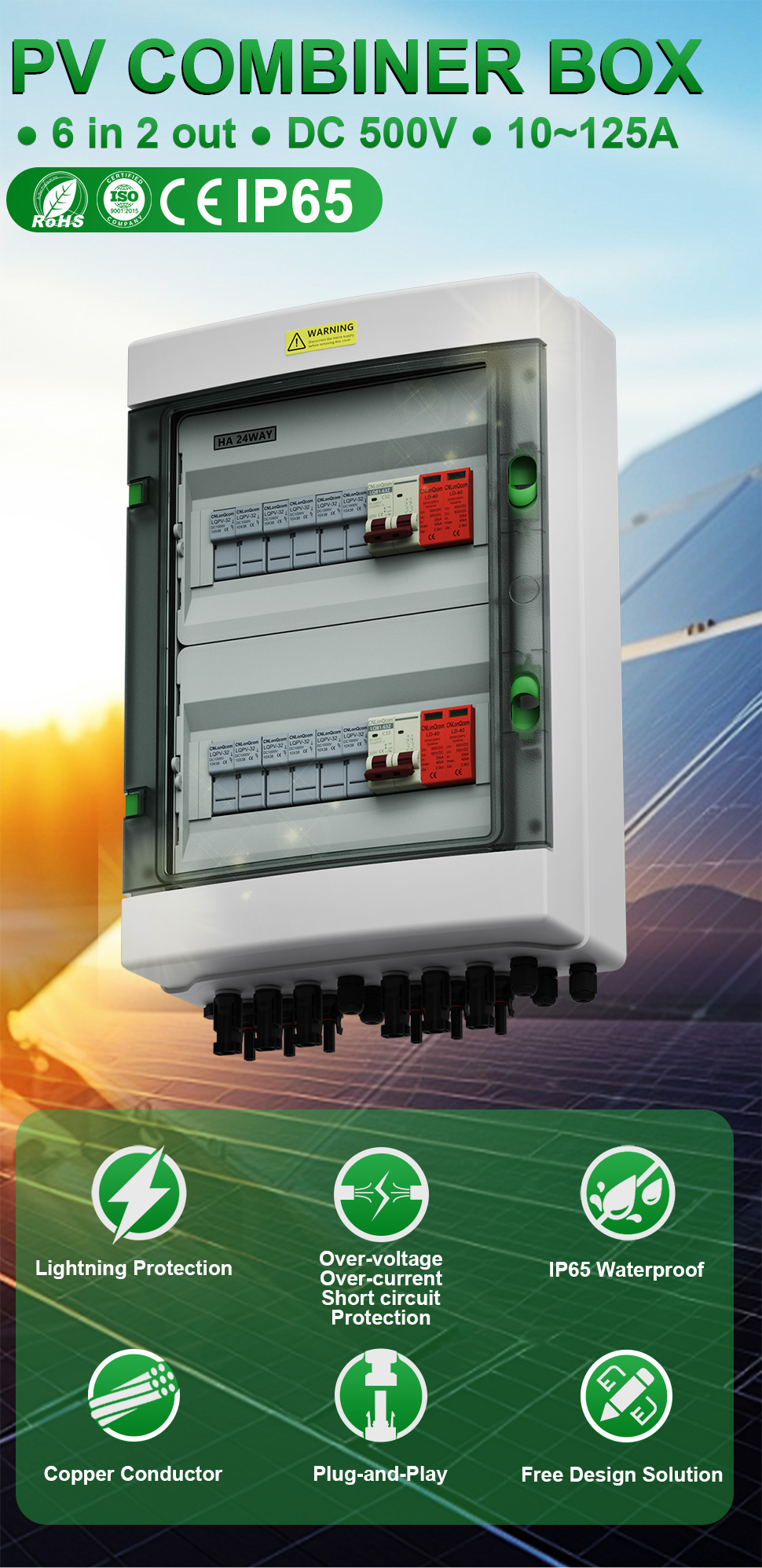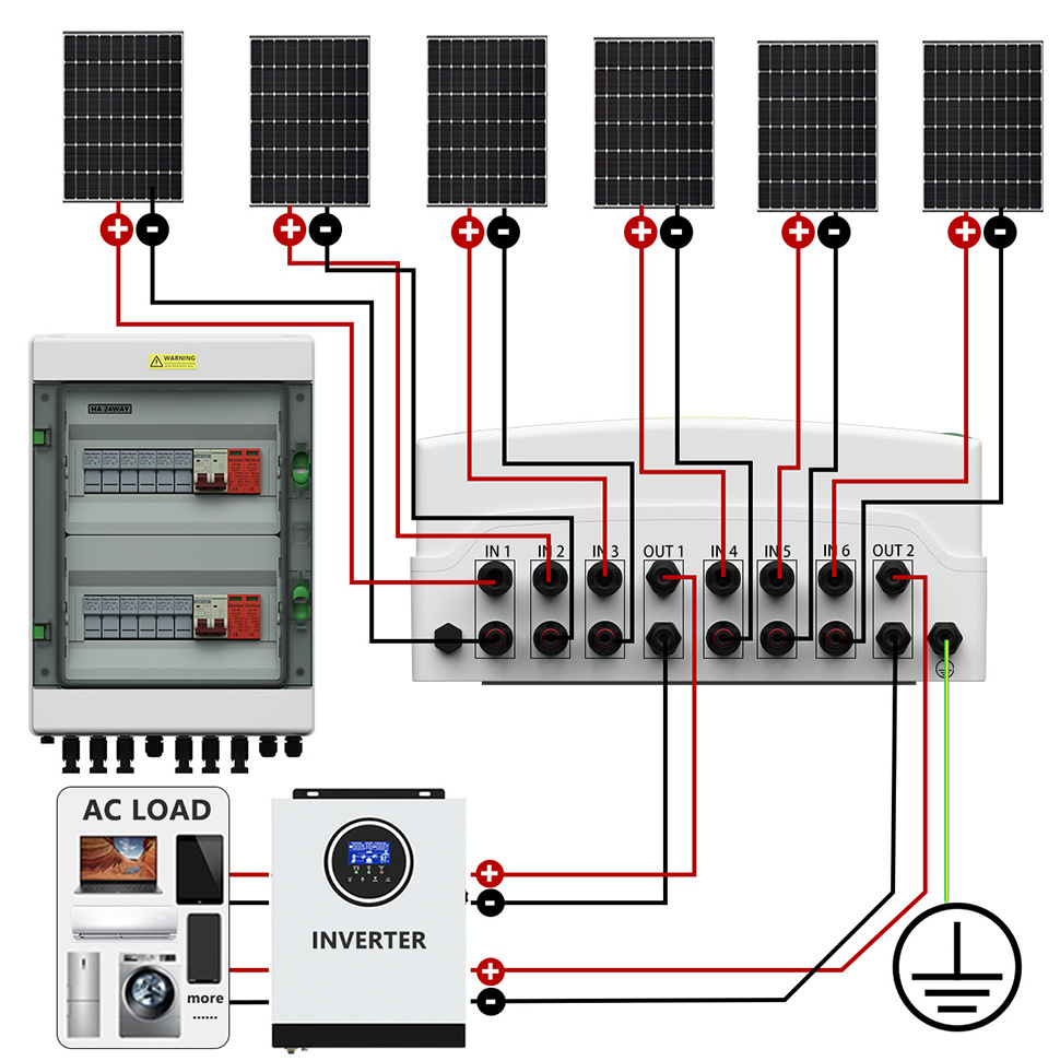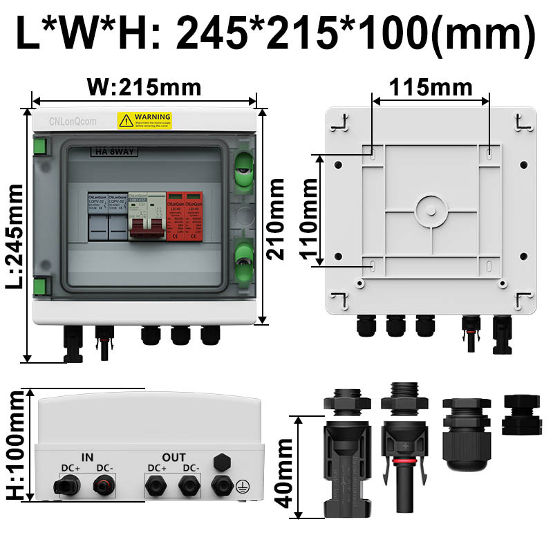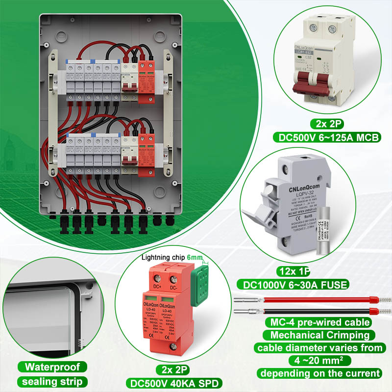 „Cnlonqcom“ „HA“ serijos plastikinis PV kombinuotojo 6 langelis iš 2 OUT DC500V turi PC+ABS vandeniui atsparų dėklą su uždaryta konstrukcija, apsauga nuo perkrovos, apsauga nuo trumpo jungimo, apsauga nuo viršįtampio, dulkių, drėgmės ir apsaugos nuo žaibiškumo.