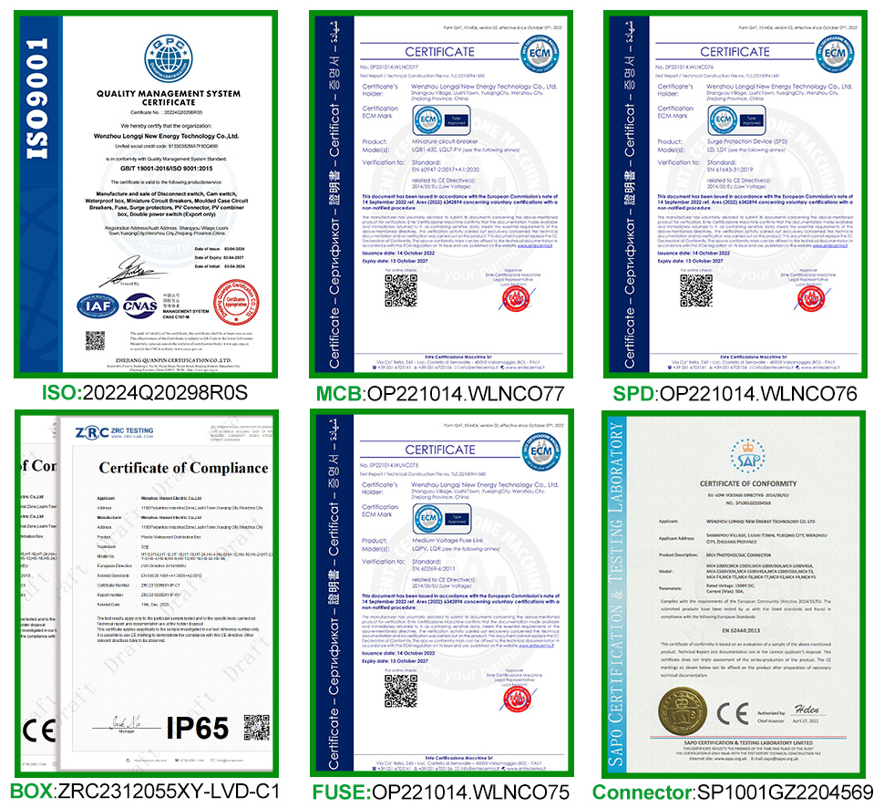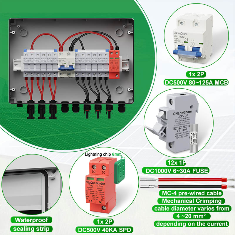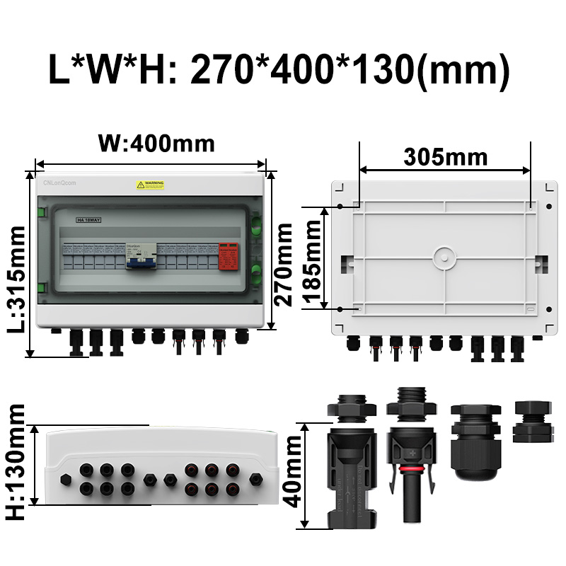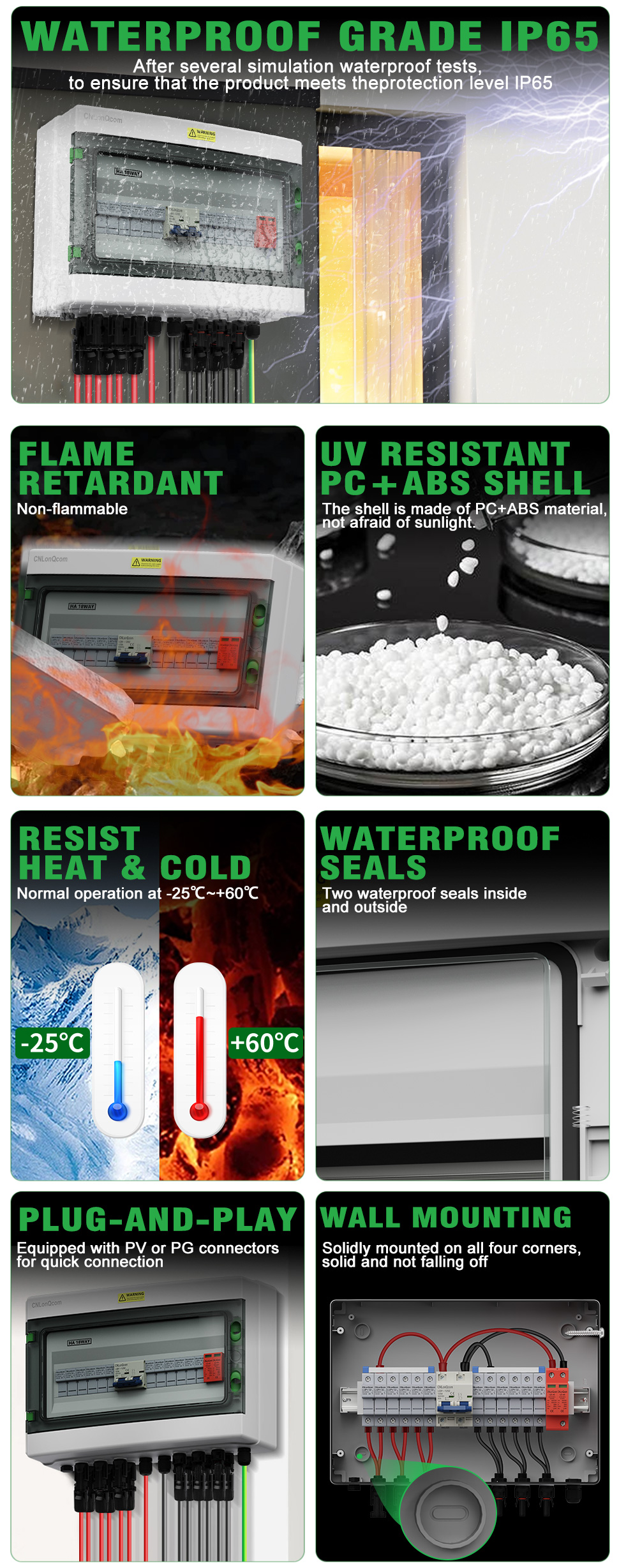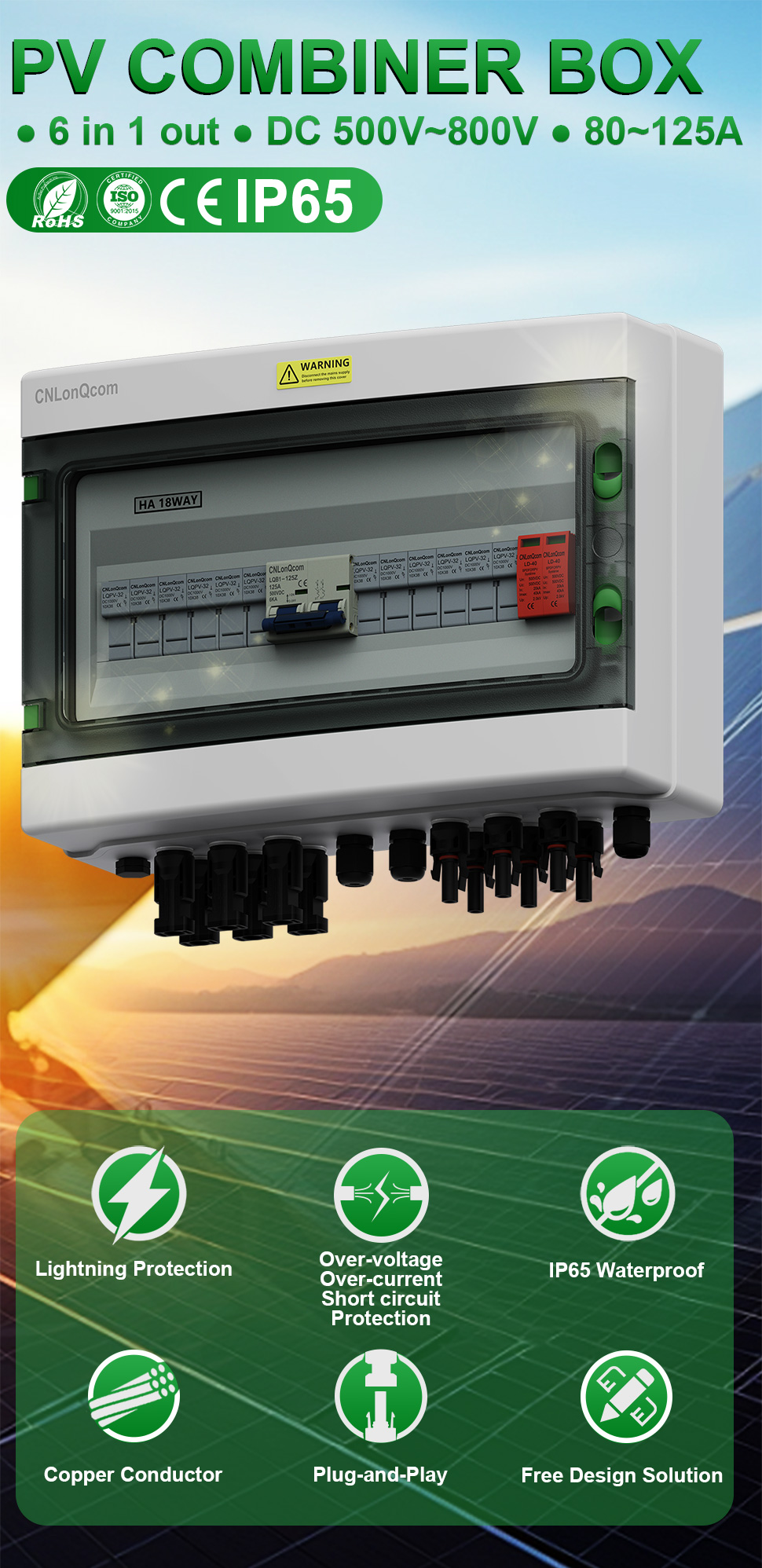 „Cnlonqcom“ HA serijos plastikinis PV kombinuotojo 6 langelis 1 iš DC500 V/600 V/800 V daugiausia naudojamas PV sistemoms apsaugoti ir dažnai naudojami ne tinkle arba su tinkle sujungtose sistemose. Tokios kaip PV plokštės, RV, valtis, lauko PV, namų ūkis ir kt.