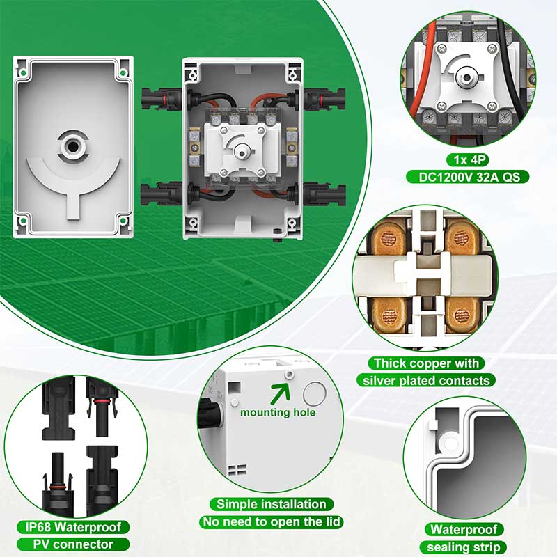● Su iš anksto prijungtais PV jungikliais ir saulės jungtimis, mūsų gaminiai leidžia greičiau ir saugiau montuoti. Su galimybe atjungti apkrovas iki 8 kartų didesnę už vardinę srovę, jie yra idealus pasirinkimas bet kokiai progai, kai reikalinga elektros izoliacija, pvz., remontas, priežiūra, tikrinimas ir montavimas.